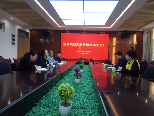 2019年11月22日,明胜m88官网鞠国泉、刘增然和巨浩羽老师赴青岛农业大学食品科学与工程公司调研学习。公司鞠国泉老师介绍了公司的基本情况,青岛农业大学食品科学与工程公司副经理孙庆杰讲解了本公司的发展历史,随后针对一流专业建设分享了宝贵的实践经验。