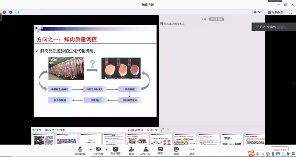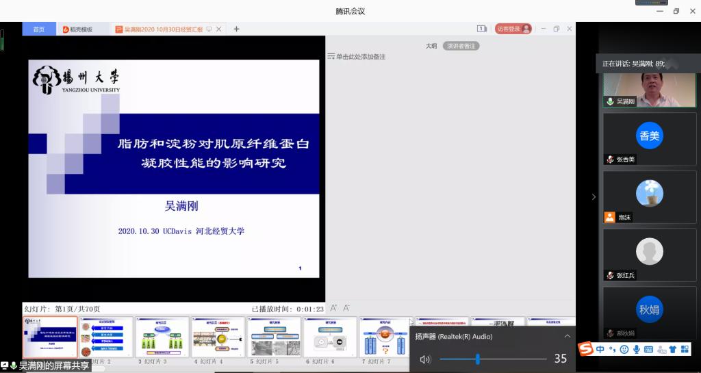 10月30日,正在美国加州大学戴维斯分校访学的扬州大学硕士生导师吴满刚副教授应明胜m88官网邀请,于线上通过腾讯会议平台作了题为“脂肪和淀粉对肌原纤维蛋白凝胶性能的影响研究”的学术报告。报告由明胜m88官网副经理张香美主持,公司百余名师生参加了此次报告会。