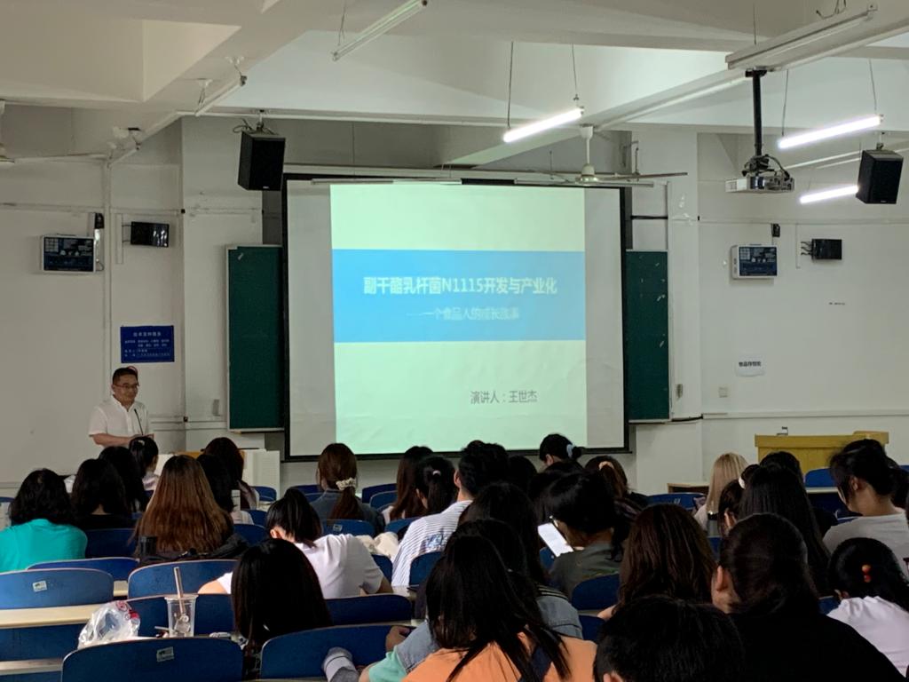 在“健康中国”的大背景下,益生菌以其强大的科技张力和融合力成为了公众对健康产品的新期待。应明胜m88官网邀请,5月31日下午,石家庄君乐宝乳业有限公司正高级工程师、国务院特殊津贴专家王世杰在B401作了题为“副干酪乳杆菌N1115开发与产业化”的专题报告。报告会由公司副经理张香美主持,公司教职工及员工200余人参加。
