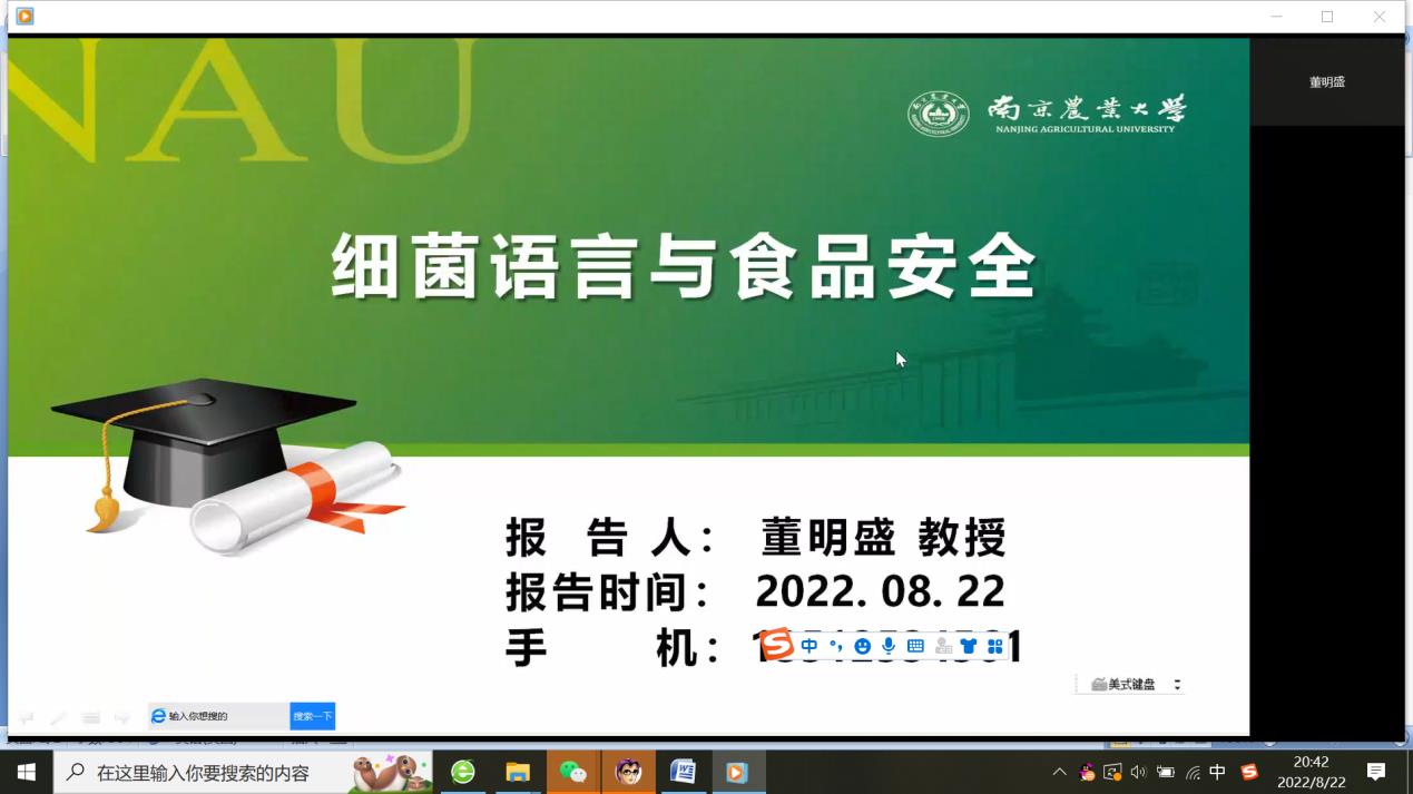 8月22日,应明胜m88官网邀请,南京农业大学董明盛教授(博导)通过腾讯会议作了题为《细菌语言与食品安全(Quorum Sensing and Food Safety)》的学术报告。报告会由公司副经理张香美主持,公司教职工及员工110余人参加。